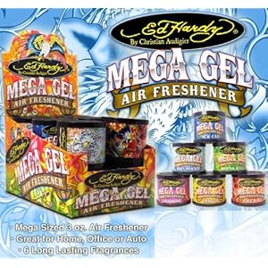 Product Description : BRAND NEW, AUTHENTIC, OFFICIALLY LICENSED by Christian Audigier Great collectible Ed Hardy authentic brand air freshener Tattoo art 3 oz. Mega Gel sized air freshener Great for bathroom, locker, home, office, auto or anywhere you desire 6 long lasting fragrances 12 fresheners per display (case) Display measures: 8.5" x 6" x 5.25" Individual freshener measures: 2.5" x 3" x 2.5" Scents: New Car, Baby Powder, Mountain Breeze, Jasmine, Vanilla, Cherry